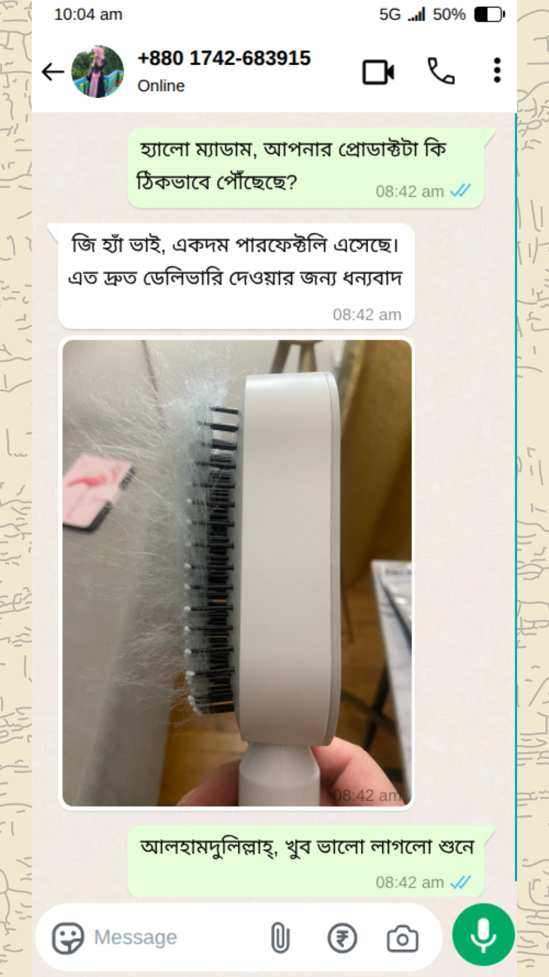 আমাদের Self-Cleaning Hair Brush-এ রয়েছে এমন এক বিশেষ মেকানিজম, যা মাত্র একটি বোতাম চাপলে বা হালকা টান দিলেই ব্রাশের মধ্যে জমে থাকা চুলগুলো নিজে থেকেই বের হয়ে আসে। এতে ব্রাশ সবসময় পরিষ্কার ও ব্যবহারের জন্য প্রস্তুত থাকে, কোনো ঝামেলা ছাড়াই।